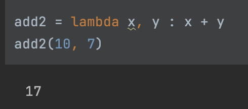 람다 함수는 표현식이므로 이름을 지정할 수도 있습니다. 아래 예제에서는 이전과 동일한 함수를 정의하지만 이번에는 "add2"라고 해보겠습니다.