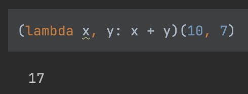 이 구문을 이용해서 맨 처음 살펴보았던 두 개의 인수 x, y를 입력받아 두 값의 합계를 반환하는 람다 함수의 기본 예제를 만들 수 있습니다.