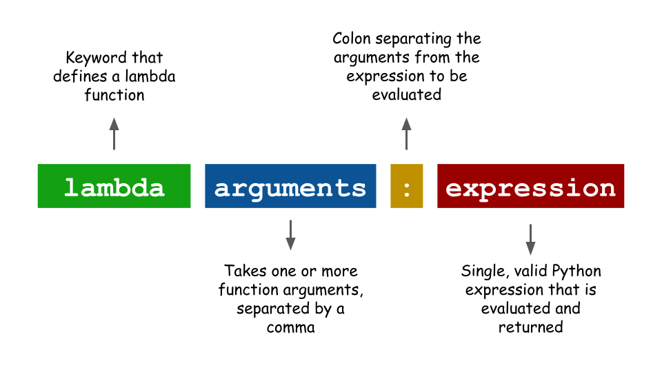 | Arguments | 인수 | 람다 함수는 하나 이상의 인수를 입력받을 수 있는데, 인수 여러개일 경우 콤마로 구분 |