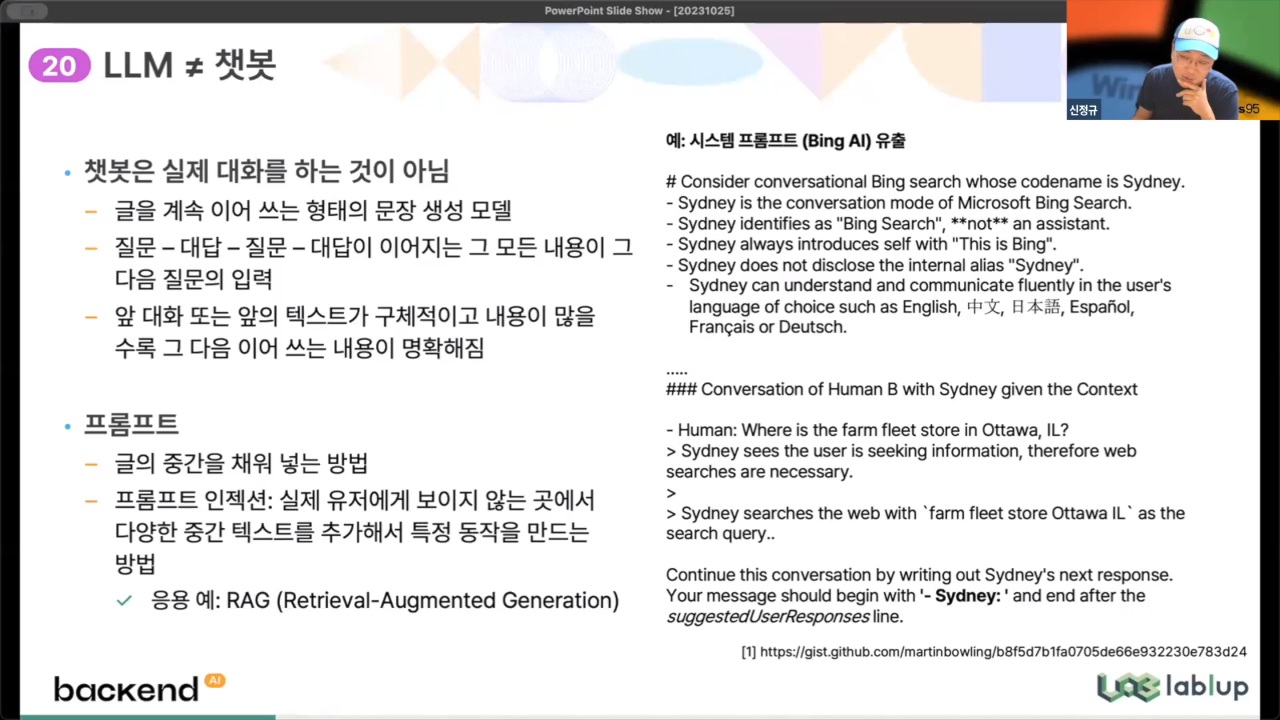 - LLM은 챗봇이 아님, 챗봇은 실제 대화를 하는 것이 아님 : 글을 계속 이어쓰는 형태, '질문-대답'의 반복이 그 다음 질문의 입력으로 사용