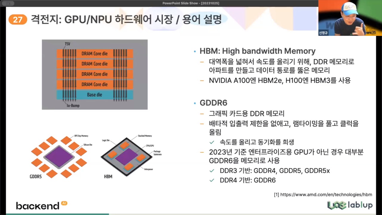 - 대역폭을 넓혀서 속도를 올리기 위해 DDR 메모리로 아파트를 만들고 데이터 통로를 뚫음 (여러 개의 D램을 수직 연결해 기존 D램보다 데이터 처리 속도를 혁신적으로 개선) |