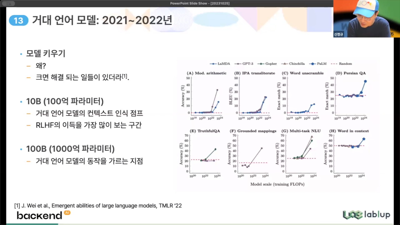 - 거대 언어 모델 : 선형적이 아닌 지수적으로 폭발적으로 증가 [18' 트랜스포머 → 20' 거대 언어모델의 특이점 발견 → 22' chatGPT 이후 계속 진화중