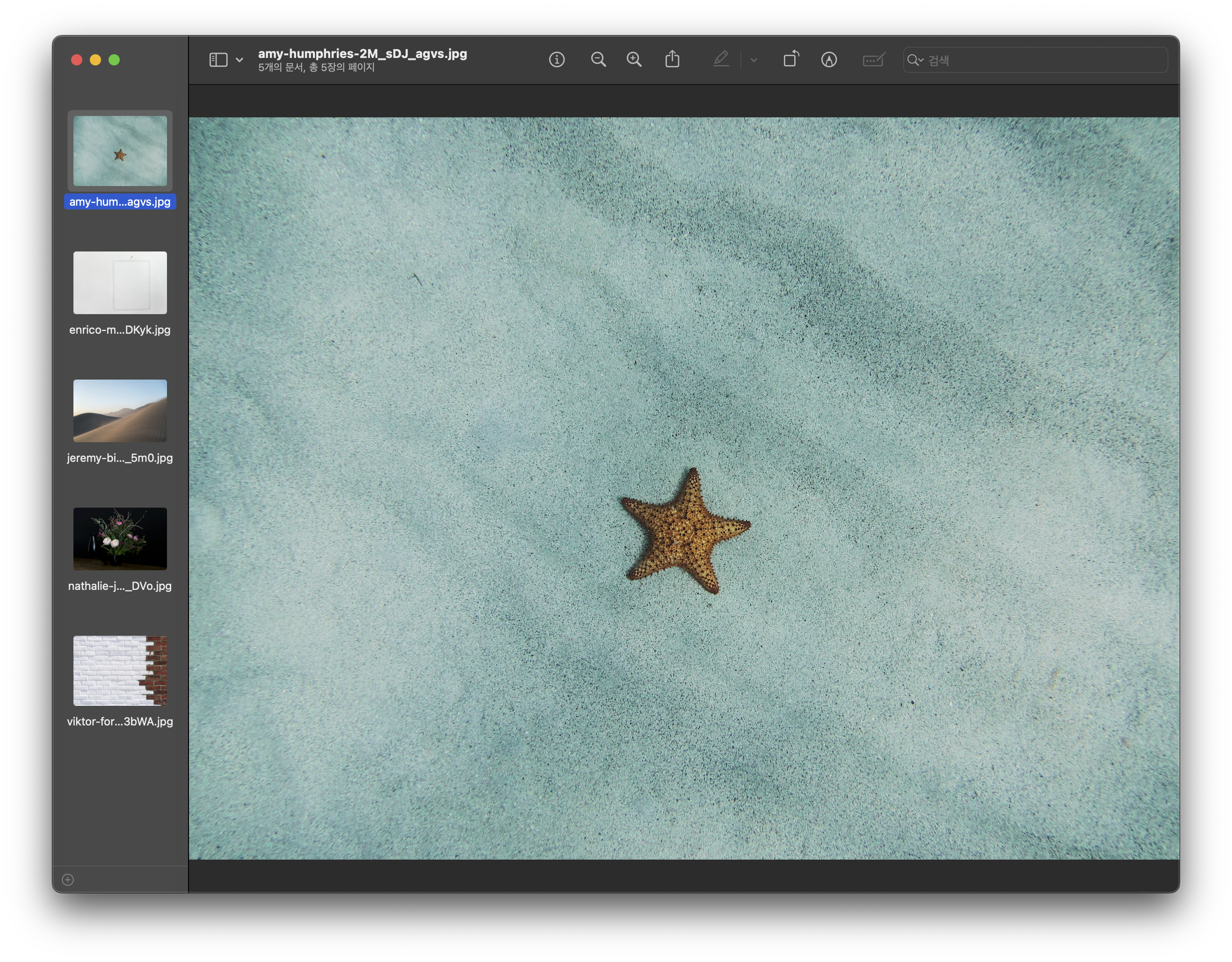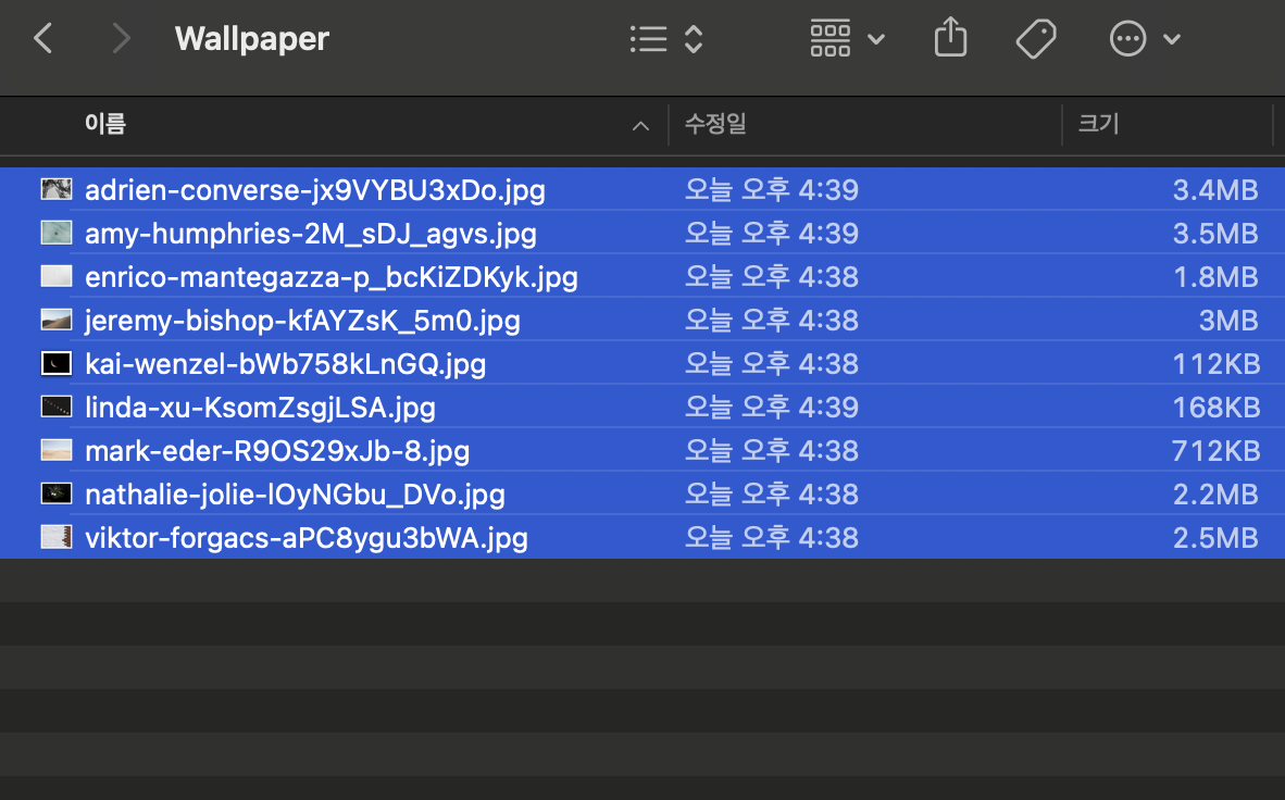 - 파일이 선택된 상태에서 command + O 키를 눌러주시면, 선택된 사진들이 리스트 형식으로 열린다. 이 상태에서는 위아래 방향키로 사진을 이동할 수 있습니다.